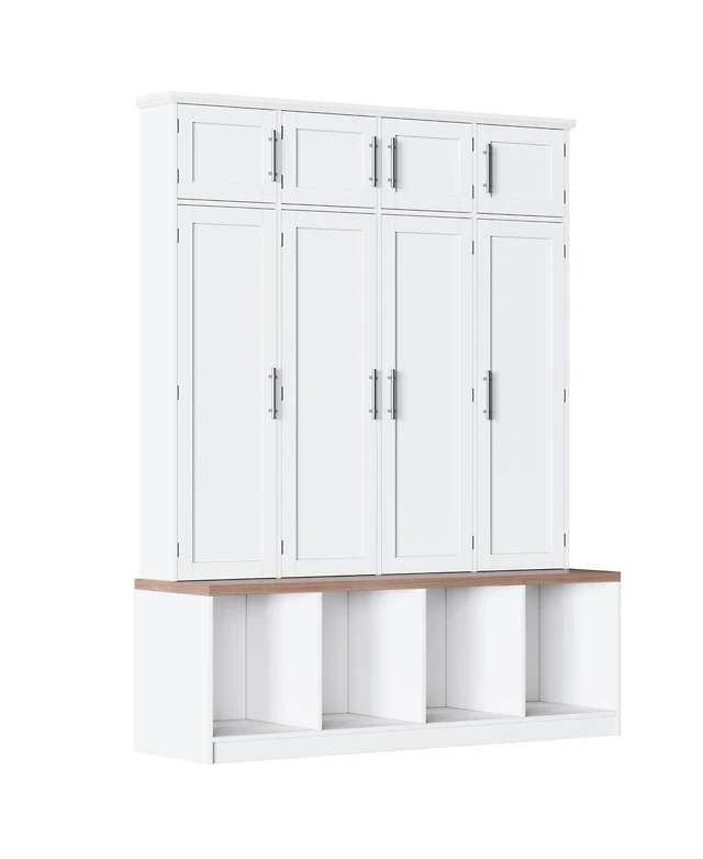 Famapy 68.5 in. White Wood 3-in-1 Hall Tree Coat Rack Storage Bench with 4-Metal Double Hooks and 2-Drawers, Shelves