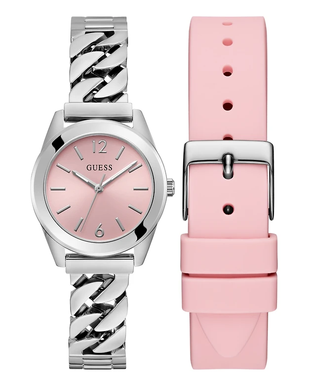 Guess Women's Analog Silver Tone Stainless Steel and Pink Silicone Interchangeable Strap Watch, 32mm