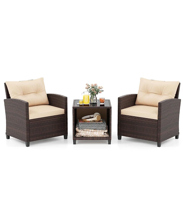 Gymax 3PCS Outdoor Patio Rattan Furniture Set w/ Chairs Coffee Table Cushions