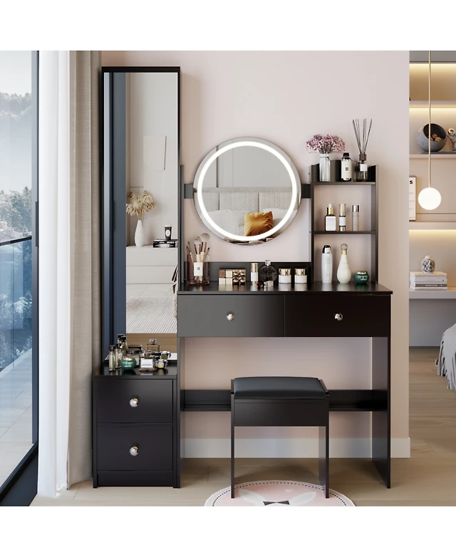 Streamdale Furniture Streamdale Multifunctional Bedside Vanity Table with - Led Mirror - Power Station - Hair Dryer Bracket - Cushioned Stool
