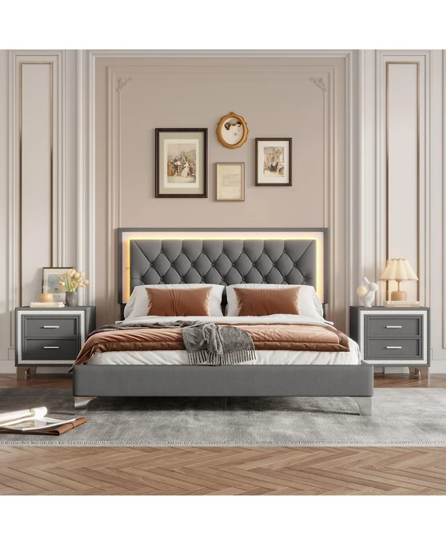 Streamdale Furniture Streamdale Grey Velvet Platform Bed with Headboard, 2 Nightstands & Diamond Tufting