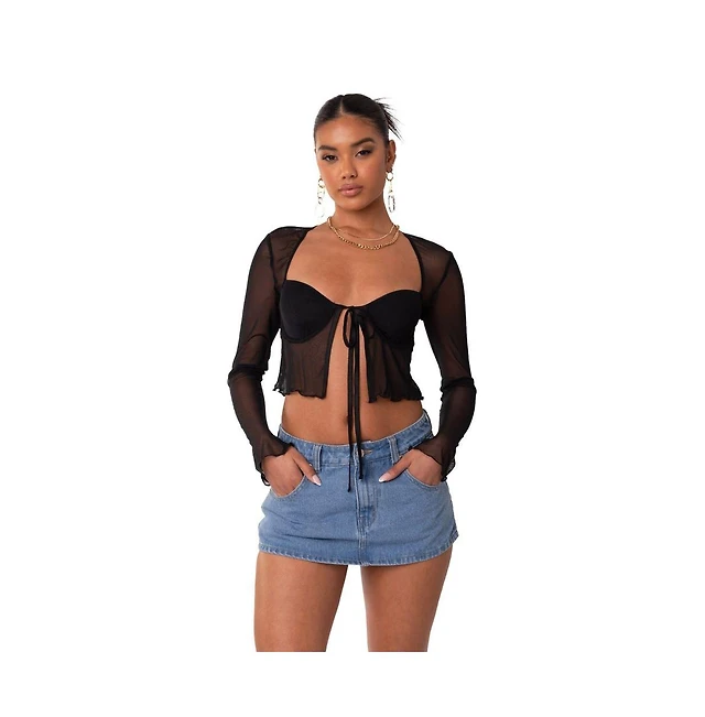 Women's Long Sleeve Mesh Top With Cups & Tie At Front