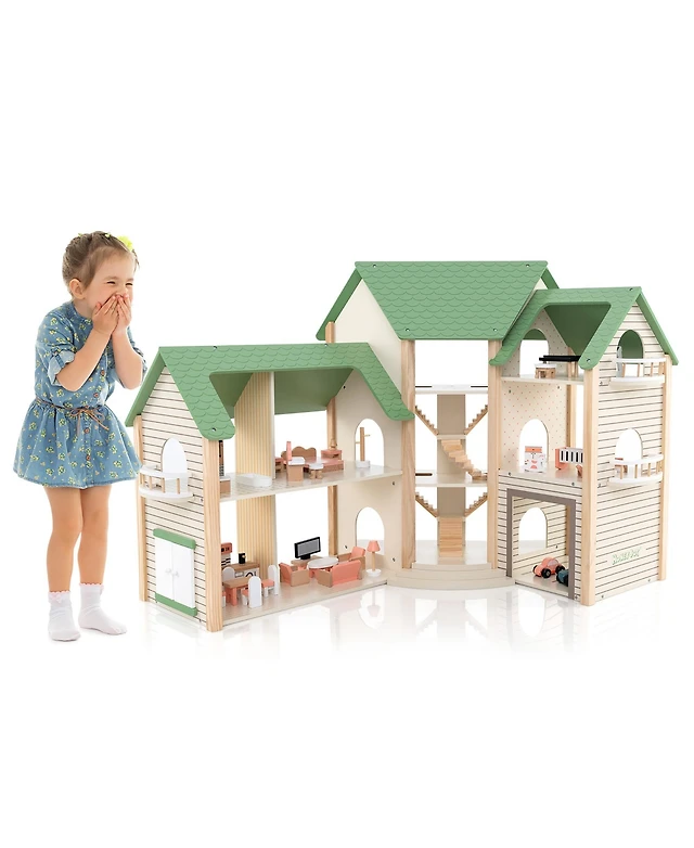 Gymax Wooden Corner Dollhouse Playset with 36 Pieces of Furniture and Accessories