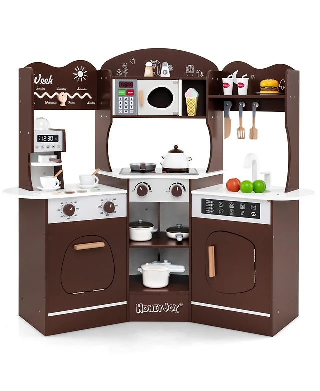 Corner Wooden Play Kitchen with Coffee Machine and Slide for Kids