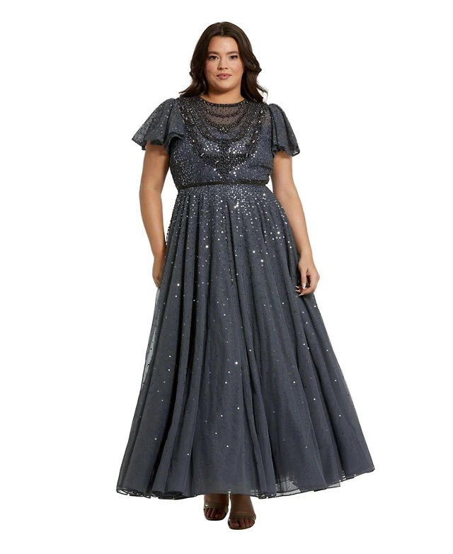 Mac Duggal Women's Sheer Flutter Sleeve Beaded Fluffy Net Gown