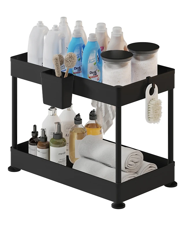 Household Essentials Glidez Paint-Finished Steel Pull-Out/Slide-Out Storage Organizer with Plastic Liners for Under Sink or Cabinet 2 -Tier Design