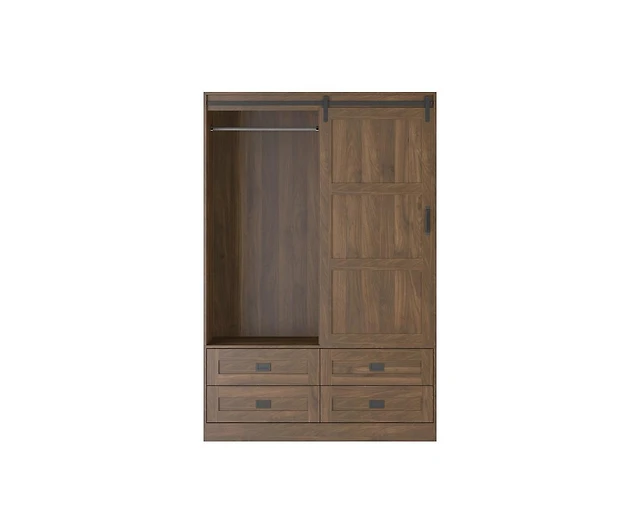 Tall Cabinet Bedroom Armoire Wardrobe Closet Clothing with Hanging Rod Barn Door Drawers Open Shelves