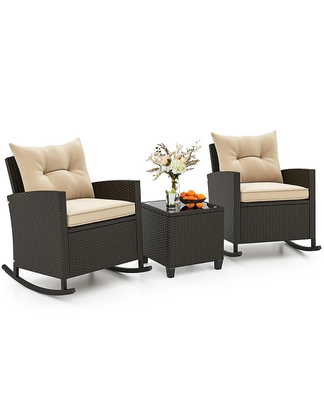 3 Pcs Patio Wicker Rocking Set with Tempered Glass Table & Soft Cushions Outdoor