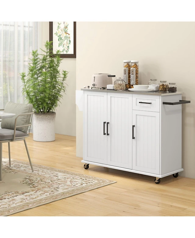 Rolling Kitchen Island Cart with Drop-Leaf and Wine Rack, White