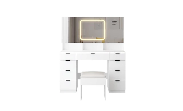 Homsee White Makeup Vanity Table Dressing Desk 3-Mirrors,Led Lighted, 9-Drawers, Hidden Storage Shelves, Carved Metal Handles