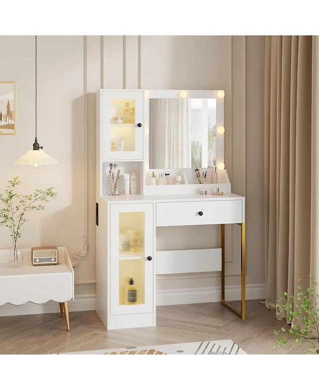 gaomon Vanity Desk with Sliding Mirror and Lights, Modern Makeup Table 4 Drawers 7 Storage Shelves