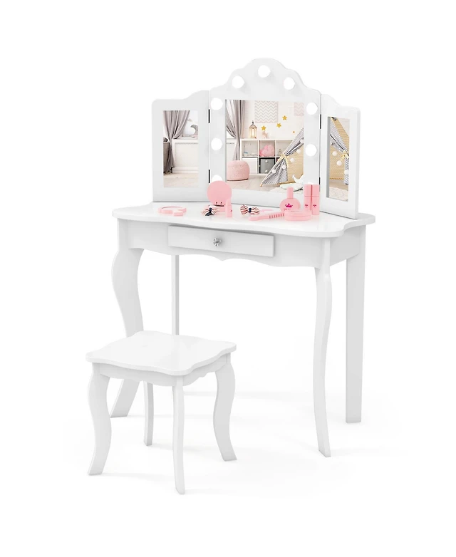 Kid's Wooden Vanity Table and Stool Set with 3-Panel Acrylic Mirror