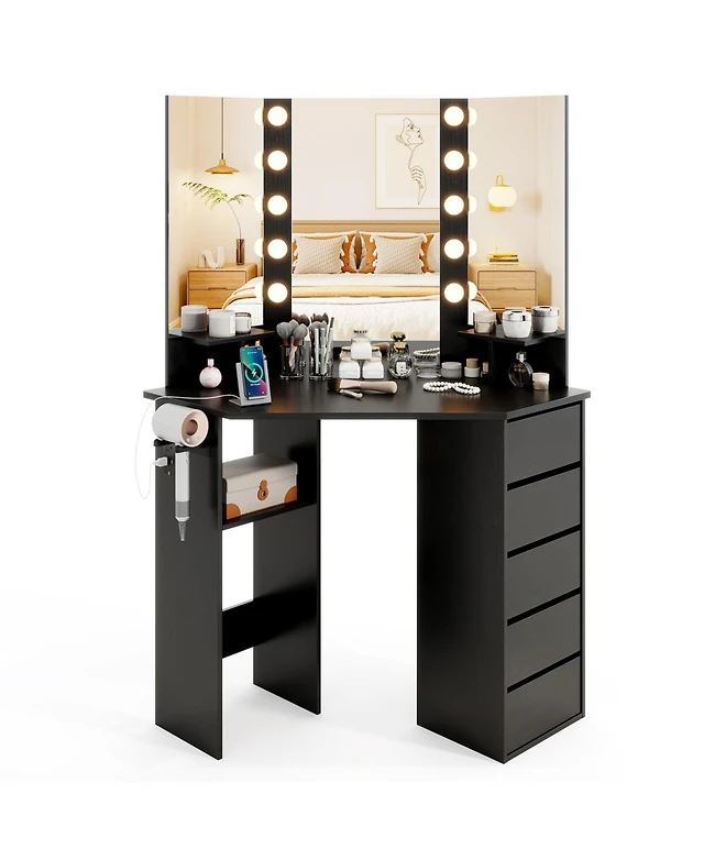 gaomon Corner Makeup Vanity Desk With Lights, Power Outlet, And Rotating Drawers-3 Color Lighting, Adjustable Brightness, Shelves, Stool