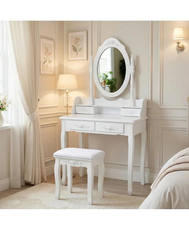 Flynama Princess Vanity Desk Set with Mirror Cushioned Stool 4 Drawer Wooden Makeup Dressing Table for Girls Bedroom