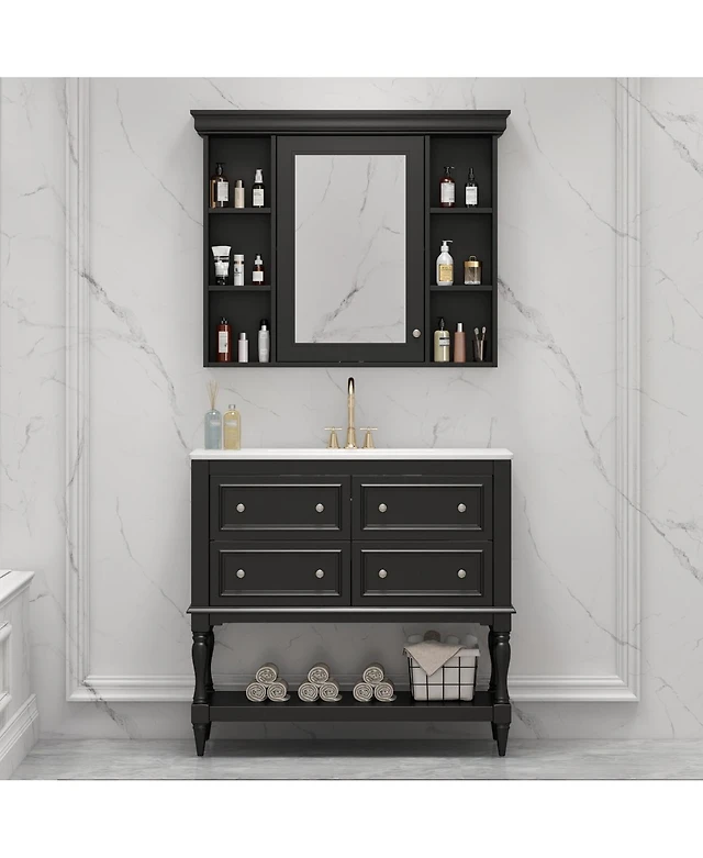 Sillysis 36" Bathroom Vanity with Sink and Mirror, Modern Freestanding Solid Wood Cabinet Storage Drawers Ceramic Top-Sillysis
