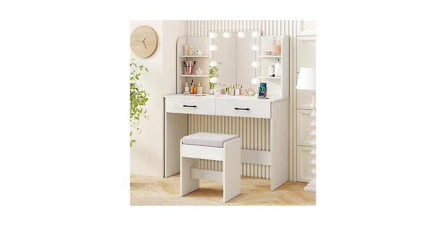 Corner Vanity Desk with 3-Color Led Lighted Mirror and Power Outlet