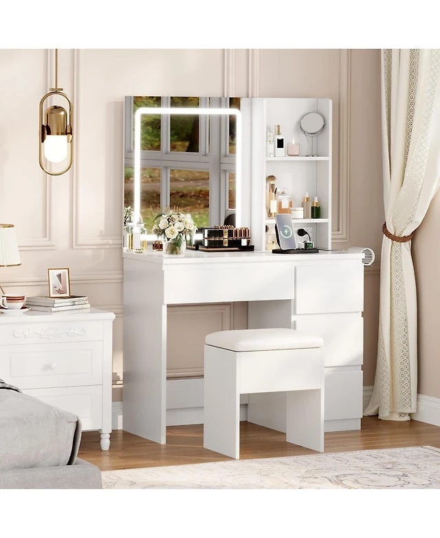 gaomon Modern Vanity Desk with Led Lighted Mirror, Power Outlet, Cushioned Stool & 2 Drawers
