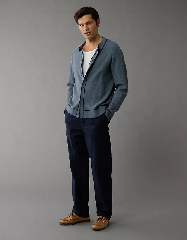 AE Long-Sleeve Tipped Waffle Sweater Polo Shirt