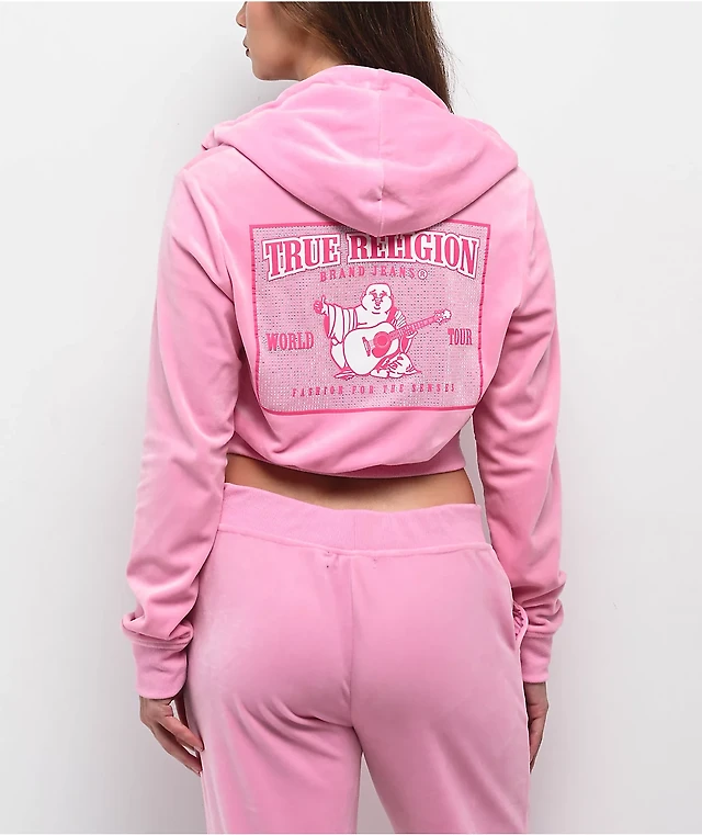 True Religion Pink Velour Crystal Shrunken Zip Hoodie