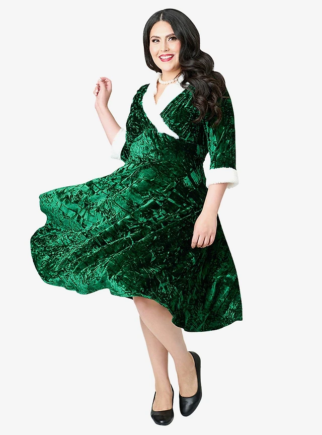 Unique Vintage Plus Emerald Crushed Velvet & White Fur Delores Swing Dress