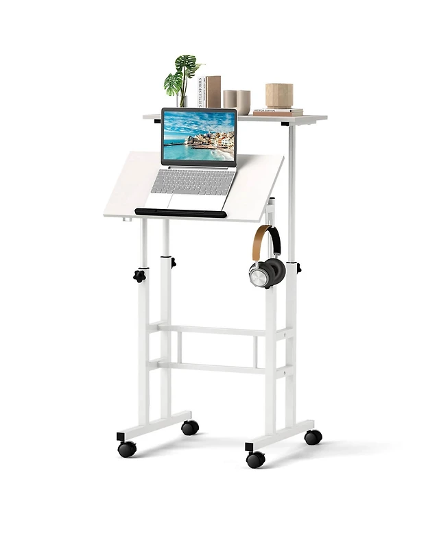 Streamdale Stretchable desk with storage shelves and wheels, foldable, white marble