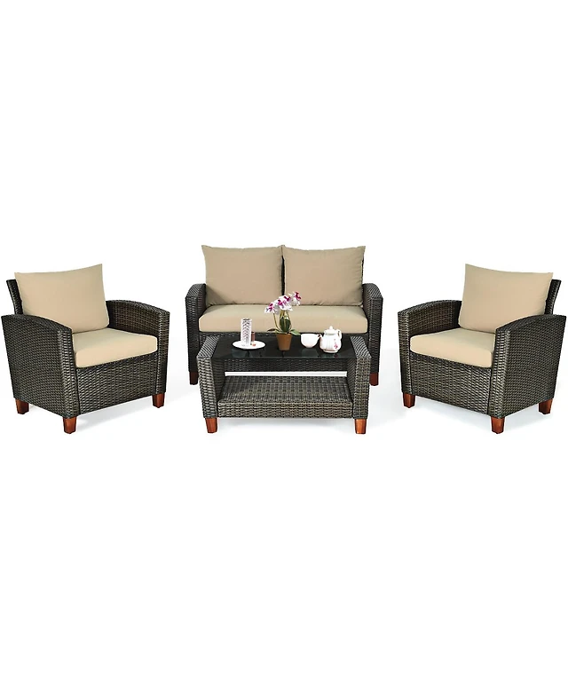 4PCS Patio Rattan Furniture Set Solid Wood Leg Cushioned Sofa Garden Lawn