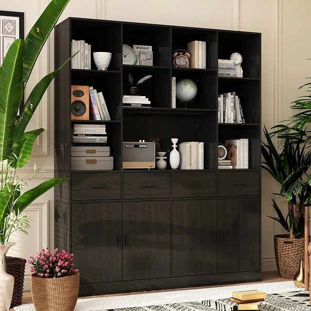 Famapy 19-Shelf Wood Standard Bookcase With Adjustable Shelves,5 Drawers