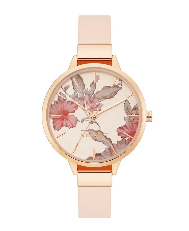 Nine West Women's Quartz Rose Gold-Tone Stainless Steel Mesh Band and Flower Pattern Watch, 35mm