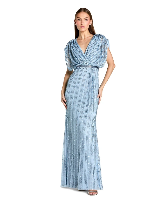 Mac Duggal Women's V Neck Flounce Sleeve Embellished Mesh Gown