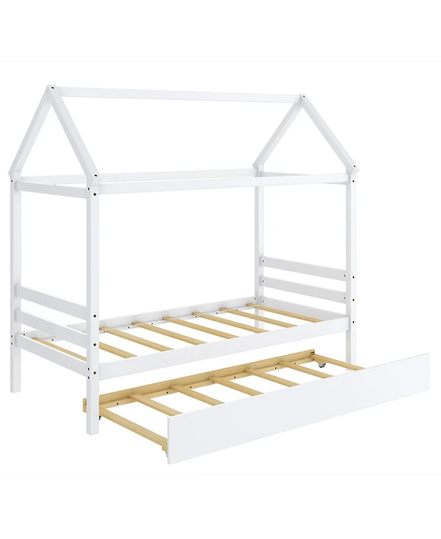 Twin Size Kids House Bed Wooden Floor Bed with Roof and Full-length Safety Guardrail