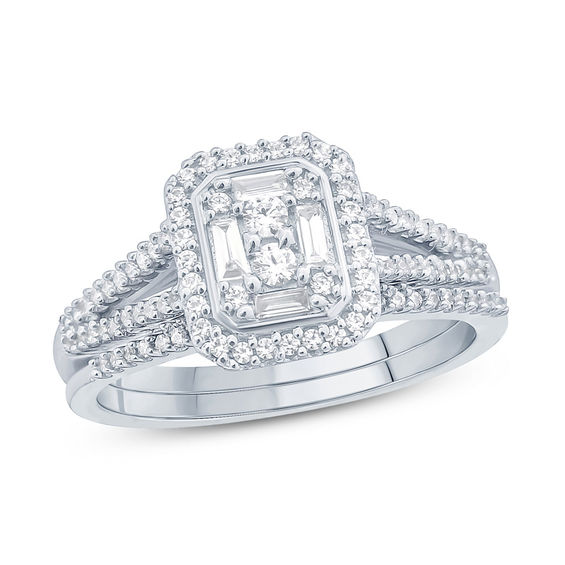 3 CT. T.w. Quad Princess-Cut Diamond Frame Multi-Row Split Shank Three Piece Bridal Set in 14K White Gold