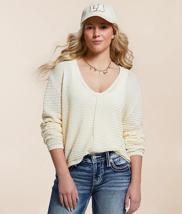 Ribbed V-Neck Long Puff Sleeve Sweater