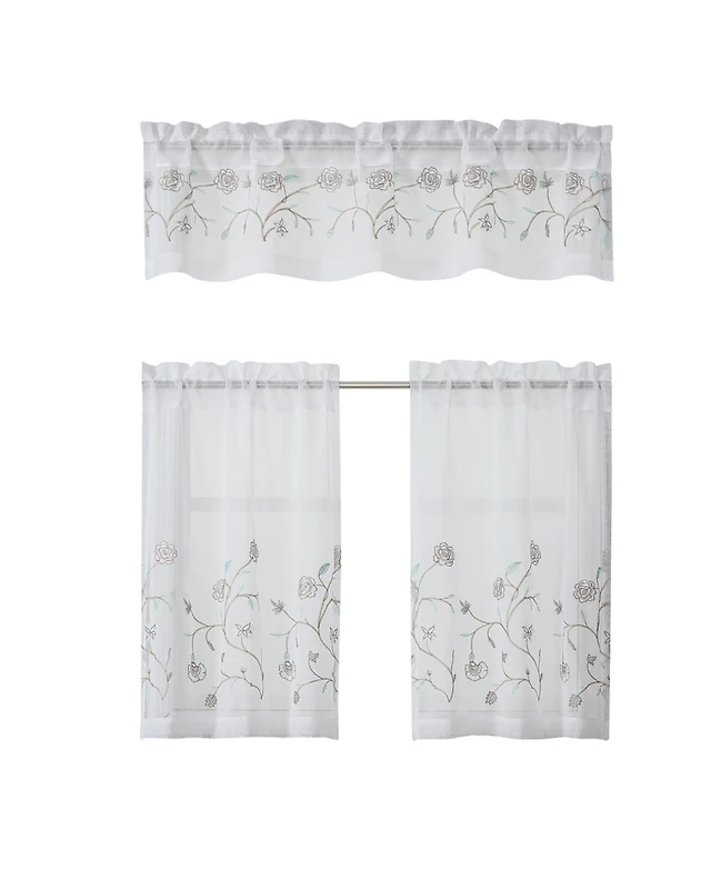 Kate Aurora Shabby Sheer Embroidered Complete 3 Piece Floral Rod Pocket Cafe Kitchen Curtain Tier & Valance Set