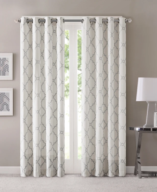 Kate Aurora 2 Pack Metallic Silver & White Lattice Clover Ultra Luxurious Window Curtains