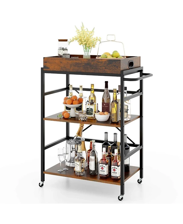 3-Tier Bar Cart with Detachable Tray 4 Lockable Casters & 1 Handy Handle