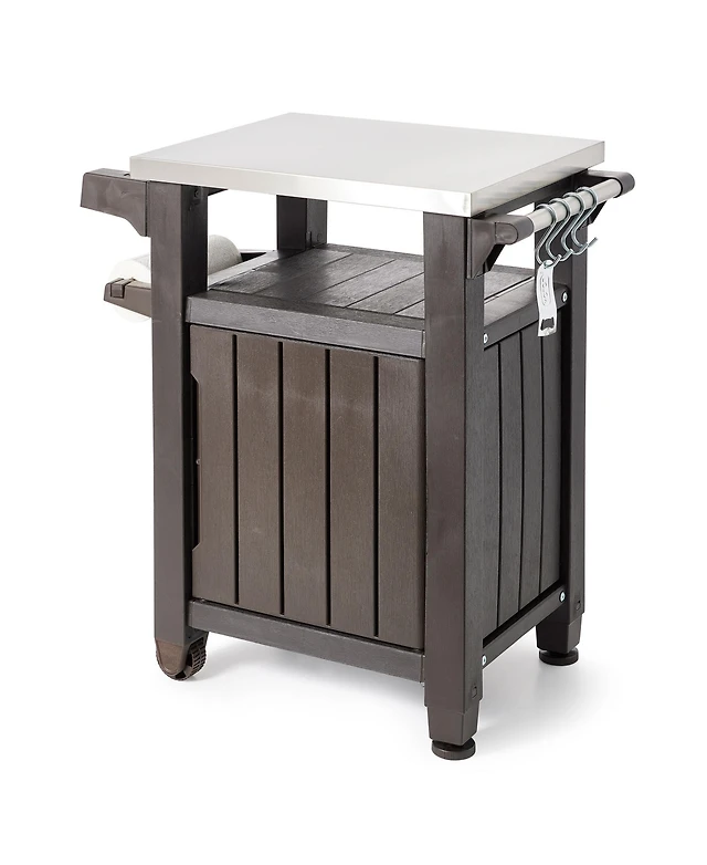 Keter Unity 40 Gal Patio Storage Grilling Bar Cart w/ Stainless Steel Top, Brown