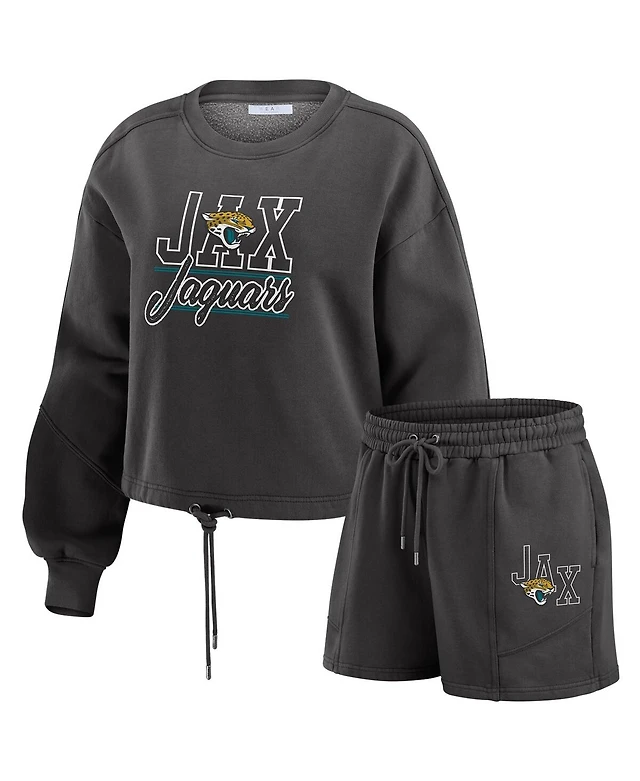 Women's Wear by Erin Andrews Pewter Distressed Tampa Bay Buccaneers Waffle Knit Long Sleeve T-shirt and Shorts Lounge Set