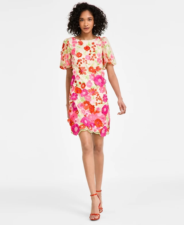 CeCe Women's Tie-Neck Embroidered Tiered Short-Sleeve Dress