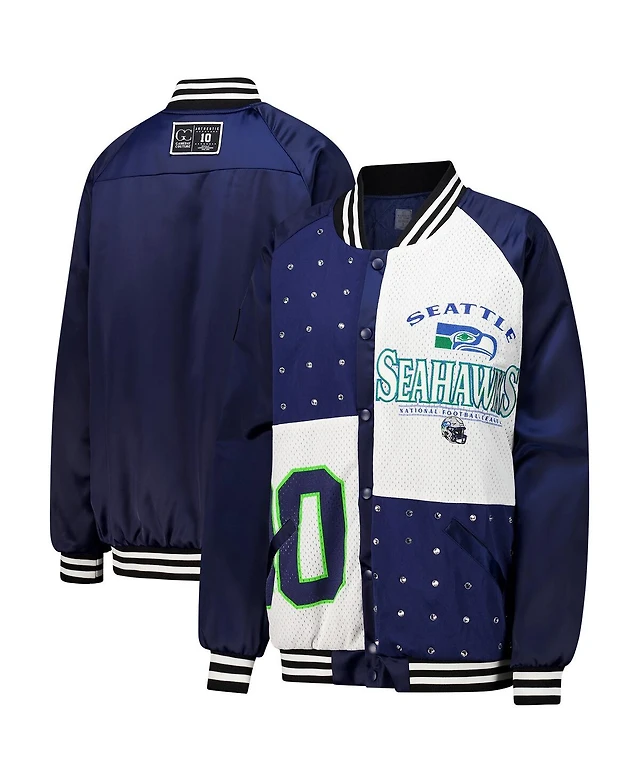 Gameday Couture Women's College Navy/White Seattle Seahawks Oversized Hot Shot Rhinestone Throwback Full-Snap Varsity Bomber Jacket