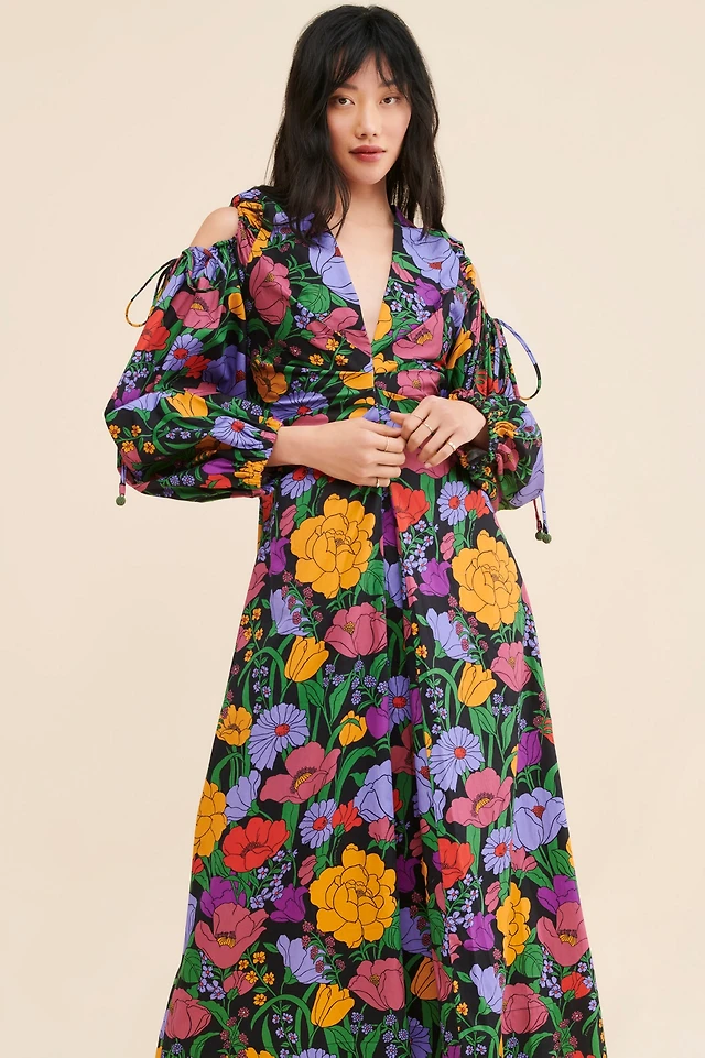 By Anthropologie Ruffle-Sleeve Floral Slip Midi Dress
