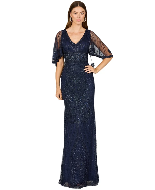 Lara Women's Beaded Gown with Satin Cape Sleeves
