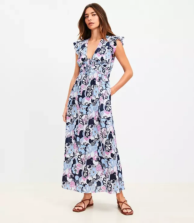 LOFT Beach Floral Ruffle Sleeve Maxi Pocket Dress