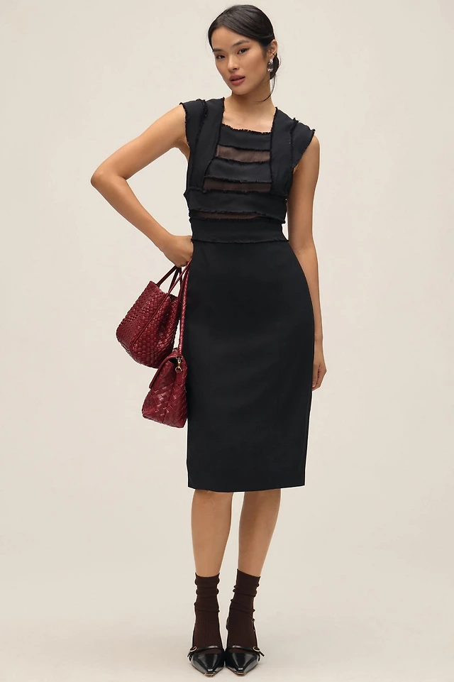 Cap-Sleeve Mesh Panel Slim Midi Dress