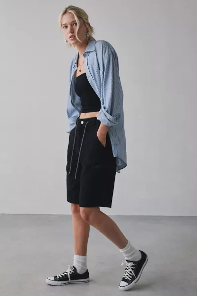 Cece Womens Contrast Embroidered Cotton Collared Shirt Embroidered Scalloped Hem Cotton Shorts