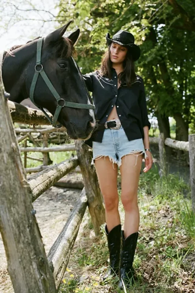 Low-Rise Medium Wash Studded Denim Shortie Shorts