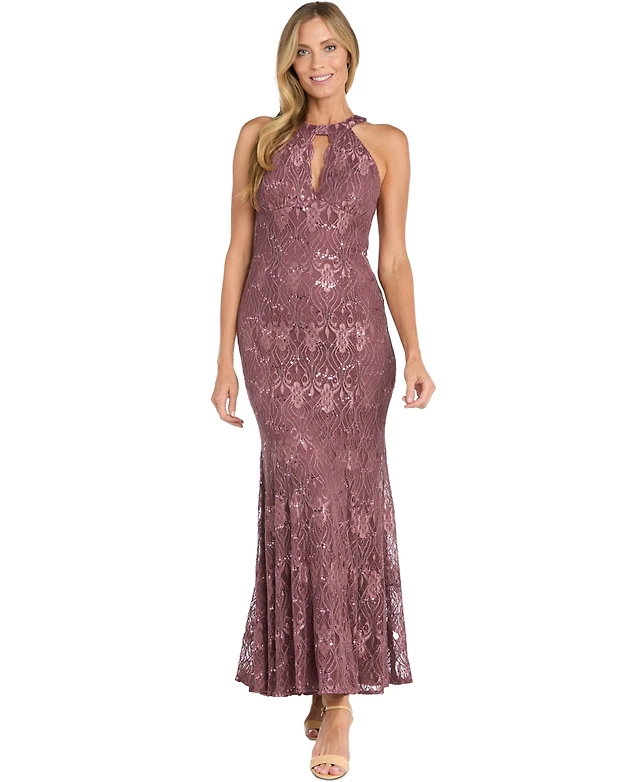 Mac Duggal Women's High Neck Lace Embroidered Detail Gown
