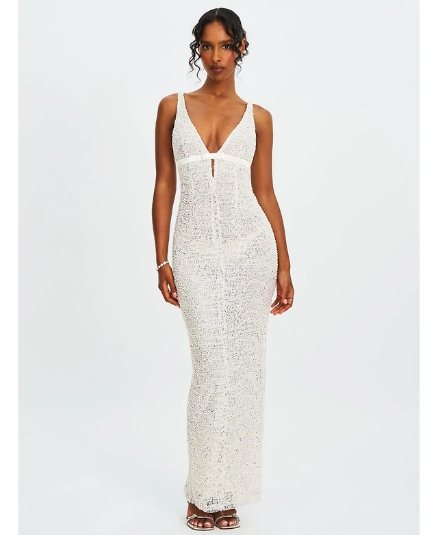 Miss Circle Women Rita Embroidered Mesh Silver Beaded Mermaid Gown