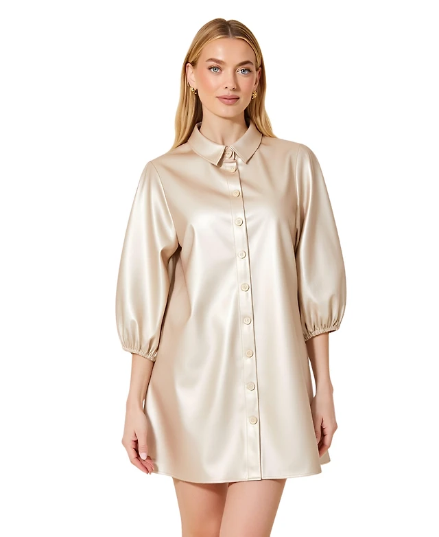 Modenaire Women's Satin Button-Front Collared Puff-Sleeve Shirt Dress