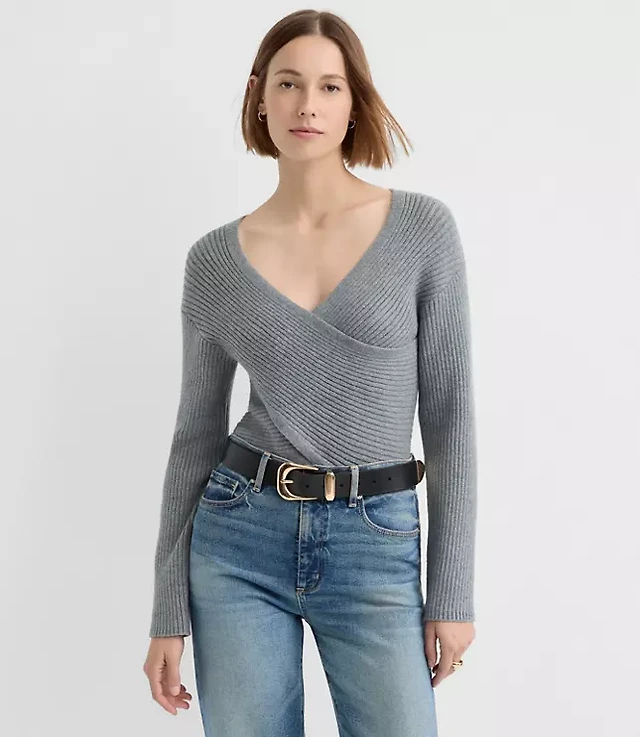 Ann Taylor Petite Metallic Ribbed Sweater Medium Light Heather Grey Women's