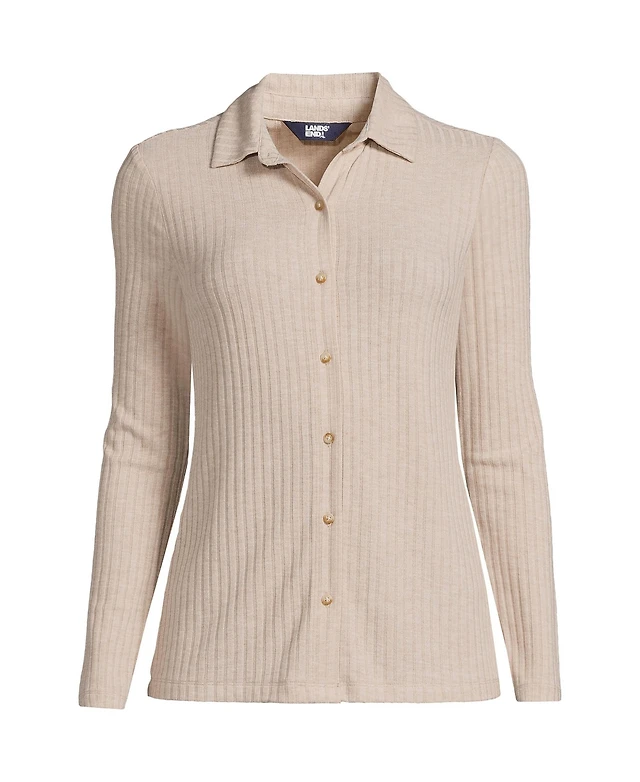 Lands' End Women's Plus Long Sleeve Wide Rib Button Front Polo Shirt